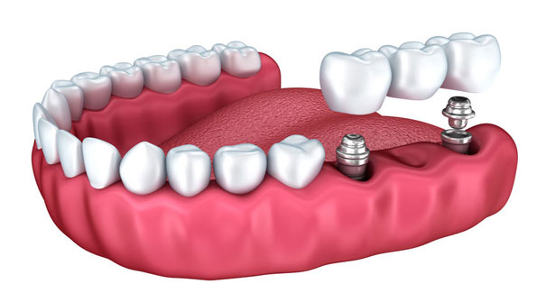 It is quite possible to use 2 implants as abutments / anchors for the placement of a bridge. This means that, for example, to replace 3 teeth only 2 implants may be sufficient (depending on the clinical situation).
